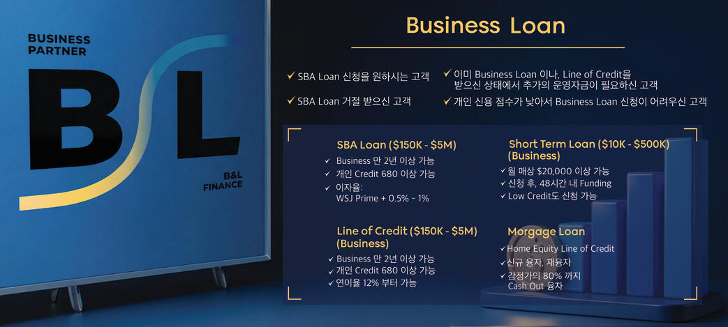 정부 보증 대출은 전문가와 함께할 때 승인 가능성이 높아집니다.· 경쟁력 있는 금리: WSJ Prime + 0.5% ~ 1.0%